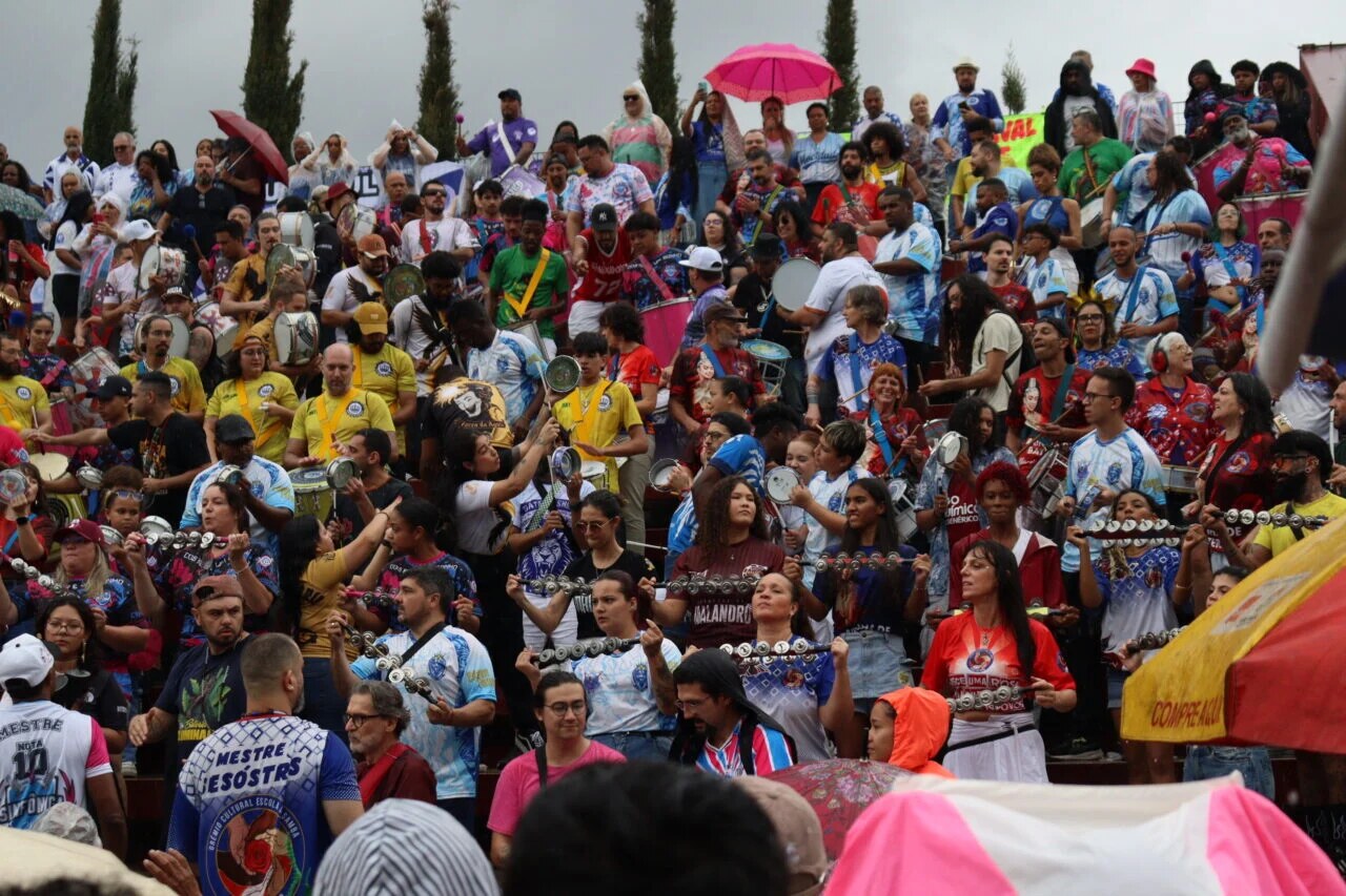 Mesmo com atraso por causa da chuva, um ato público em defesa do Carnaval de Curitiba reuniu, neste domingo (26), escolas de samba, blocos carnavalescos e apoiadores. A concentração aconteceu nas Ruínas de São Francisco e mobilizou representantes do setor cultural da cidade.